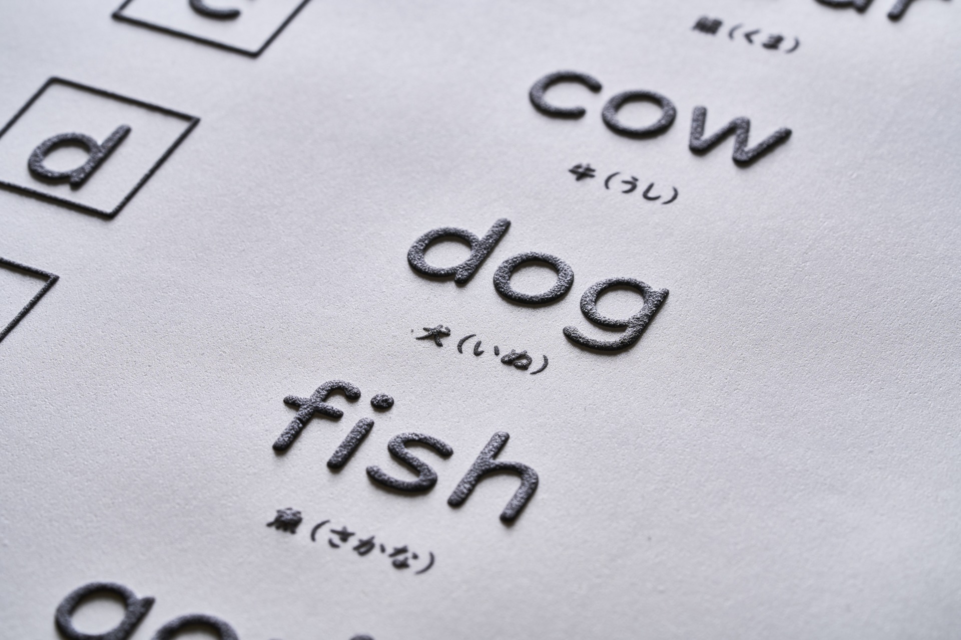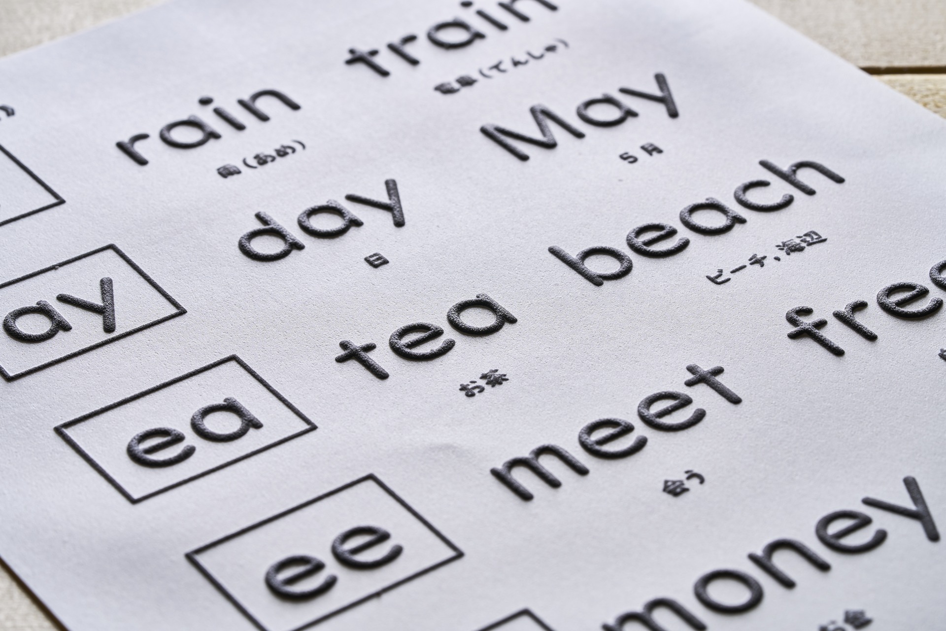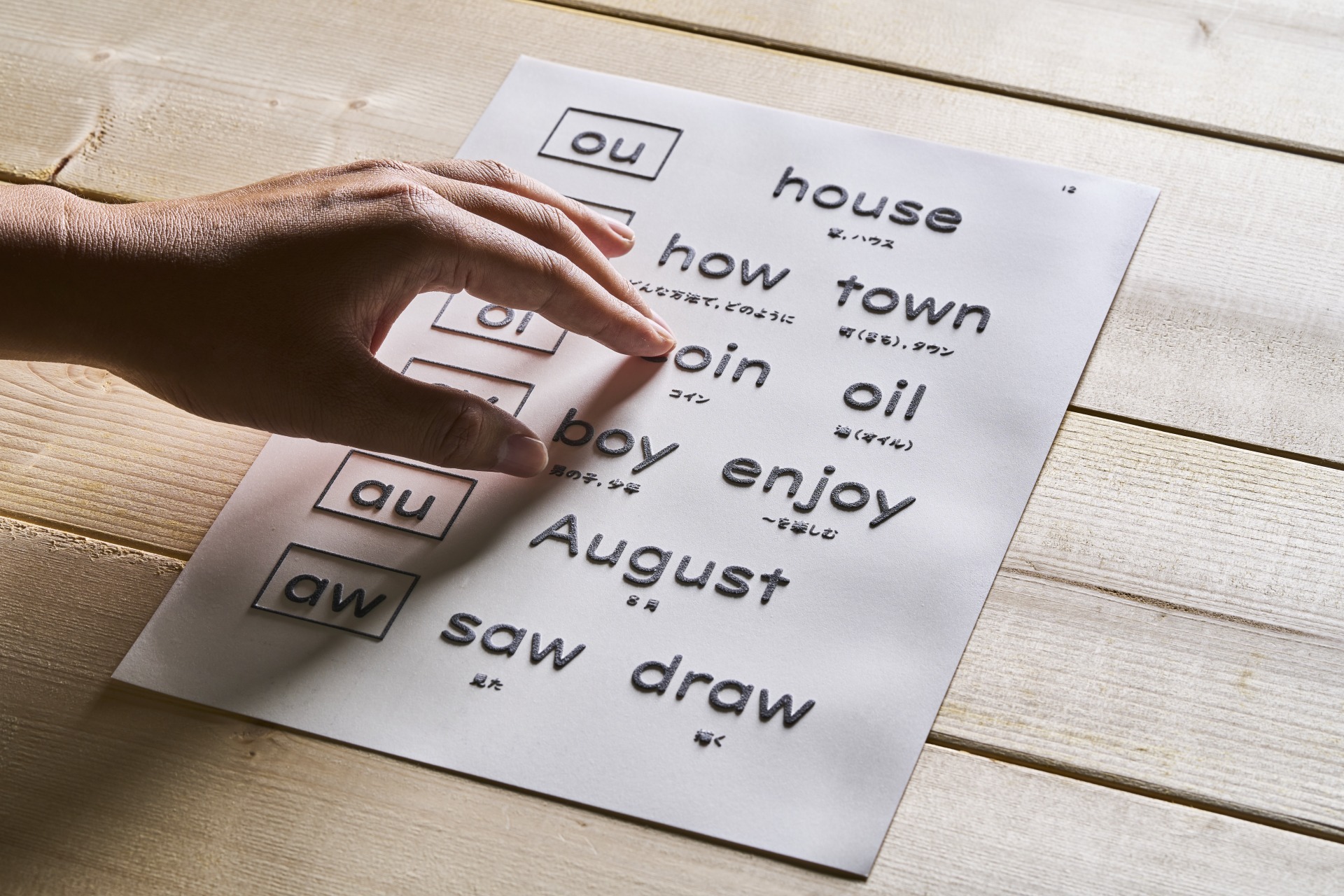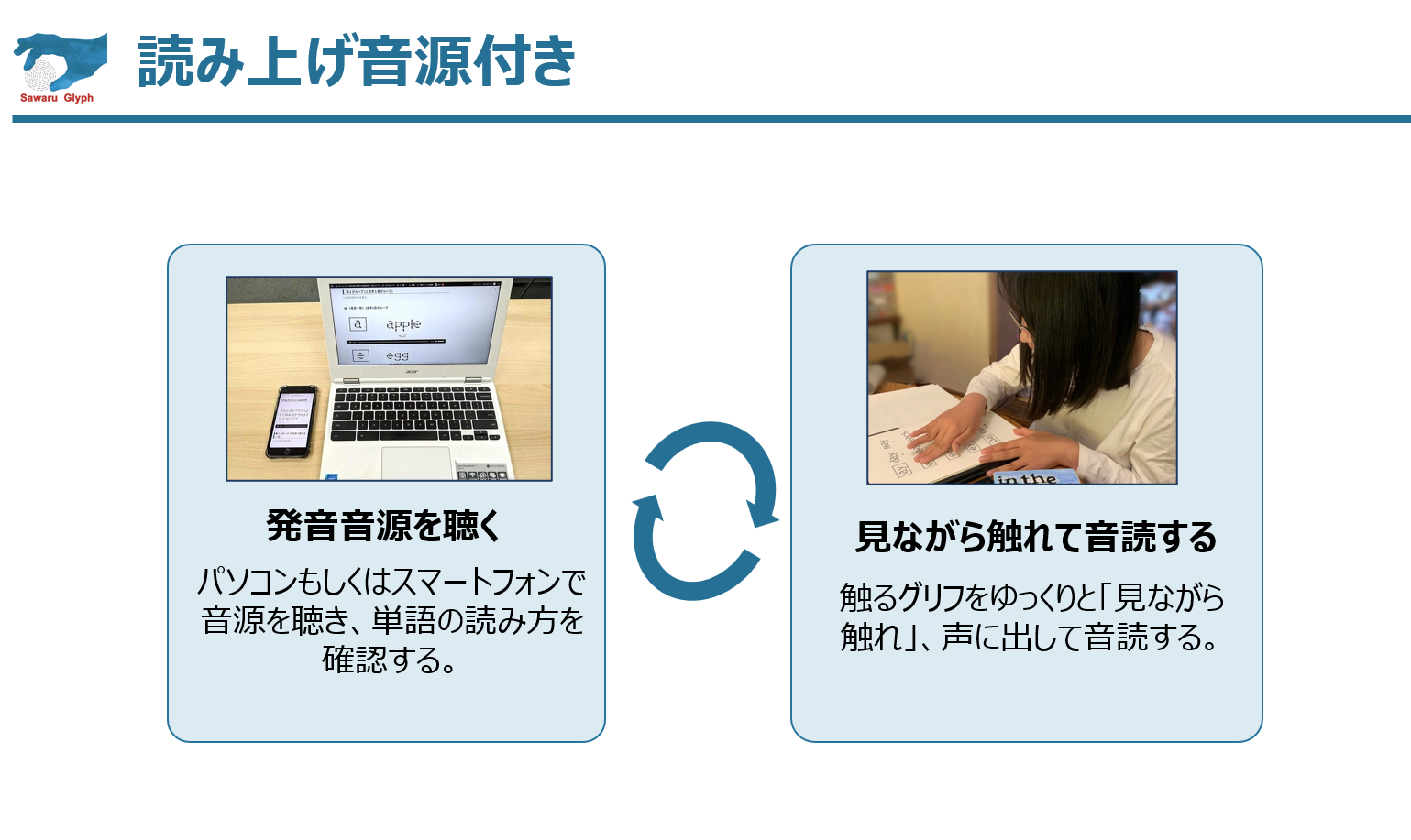 触るグリフで英単語を見ながら触れて音読すると、触覚刺激を認知的なキュー(手がかり)として、効果的な「スペル」と「読み方(音)」の結びつき(連合記憶形成)を促すことが出来ます。