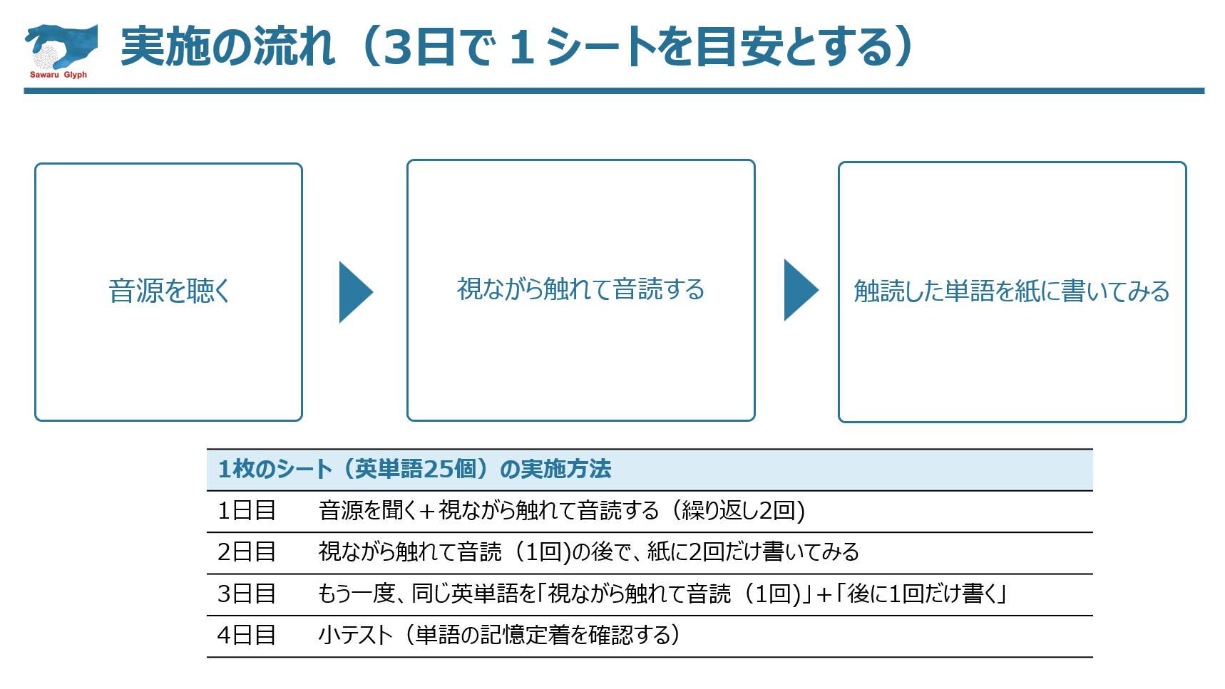 基本的な「実施の流れ」として、フォニックスに対応した単語を段階的に学ぶ『① フォニックス版シート』で「スペルと読み方」の結びつきを形成してから、さらに『② 英単語記憶定着シート』で実際に沢山の英単語のに触れる事で汎化を促す①⇒②の方法を推奨しています。