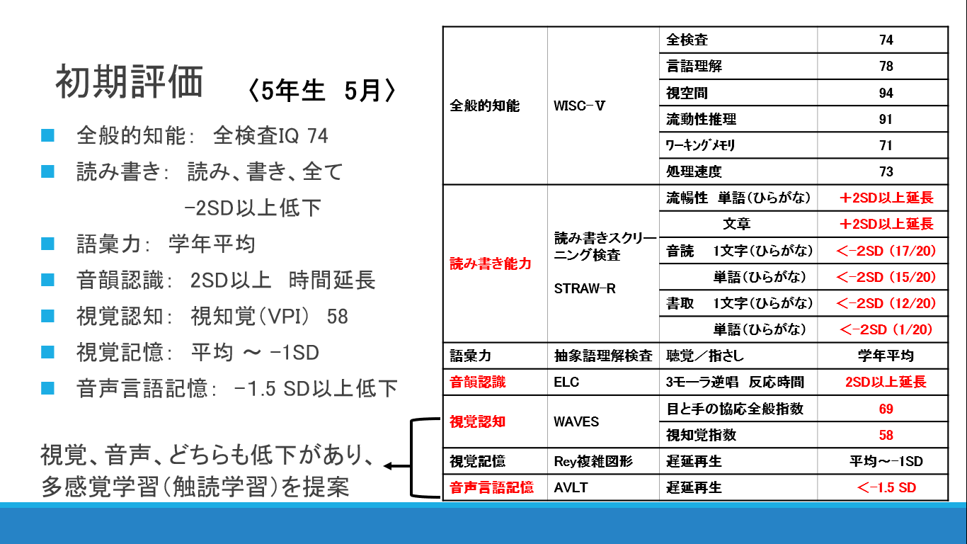 初期評価の結果です。読みは流暢性も書字課題も全ての項目で、2SD(+-)を超えていました。音韻意識や視覚認知機能など、読み書き能力の背景認知機能の成績も低い状態です。全般性知能はWISKで74であり、境界域に相当します。言語理解項目の低さから、語彙知識が身に付きにくい状態である事がわかります。ワーキングメモリ課題の低さでは、音韻意識の低さなどからも、頭の中での音韻表表象の弱さが垣間見えます。