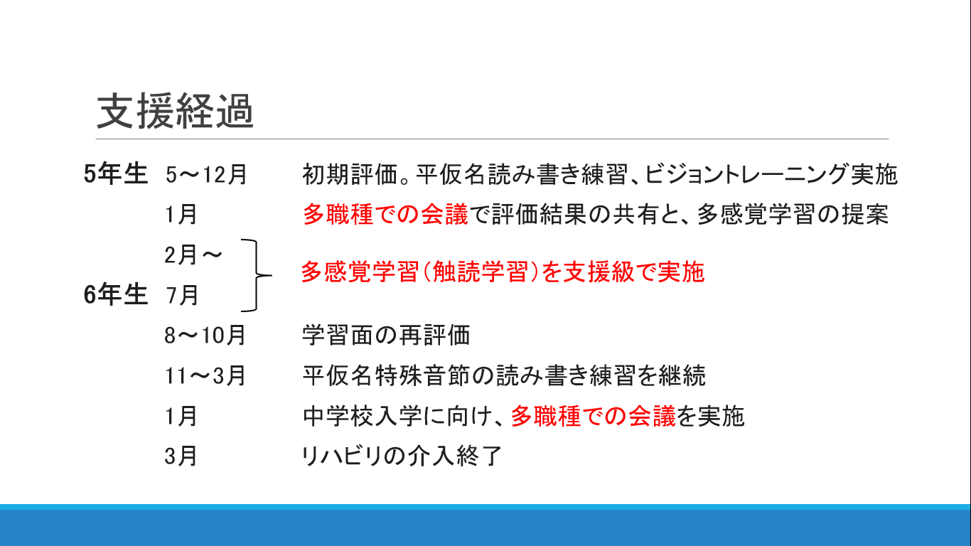 5年生の5月時点の初期評価の段階で、ビジョントレーニングと通常の平仮名の読み書き練習もしていたようです。12月に入ってから病院の医師や学校の支援級の先生、保護者の方を交えて、多職種での会議を行い、そこで多感覚学習法(触るグリフ)を支援級で実施する事が決まったようです。こういう医療機関と学校の連携会議は珍しいので、素晴らしい事だと思います。触るグリフの実施は、5年生の2月から、6年生の7月までの5か月間のようです。その後も引き続き通常の仮名の読み書き指導を継続して、6年生1月に、中学入学へ向けての全体の多職種会議を終えた後、3月にリハビリ終了となりました。