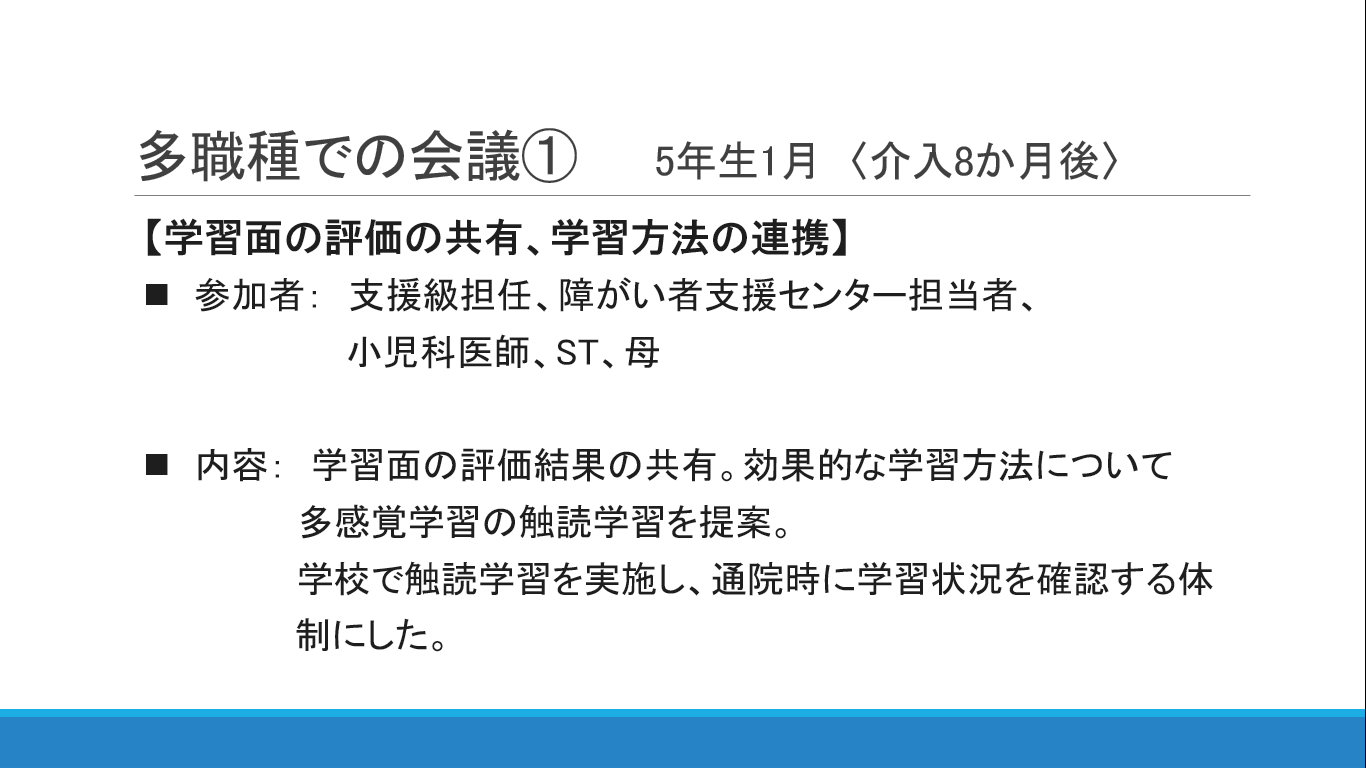 5年生1月時点の多職種会議でお話しされた内容となります。触るグリフの提案と、病院での定期評価、学校への評価結果の共有などをお話しされたようです。学校側も学習状況を医療機関と共有するなど