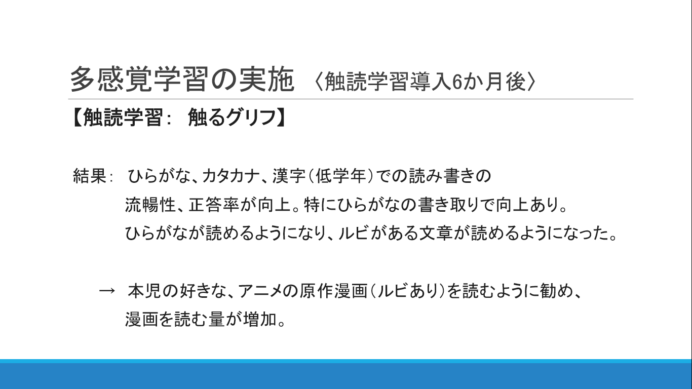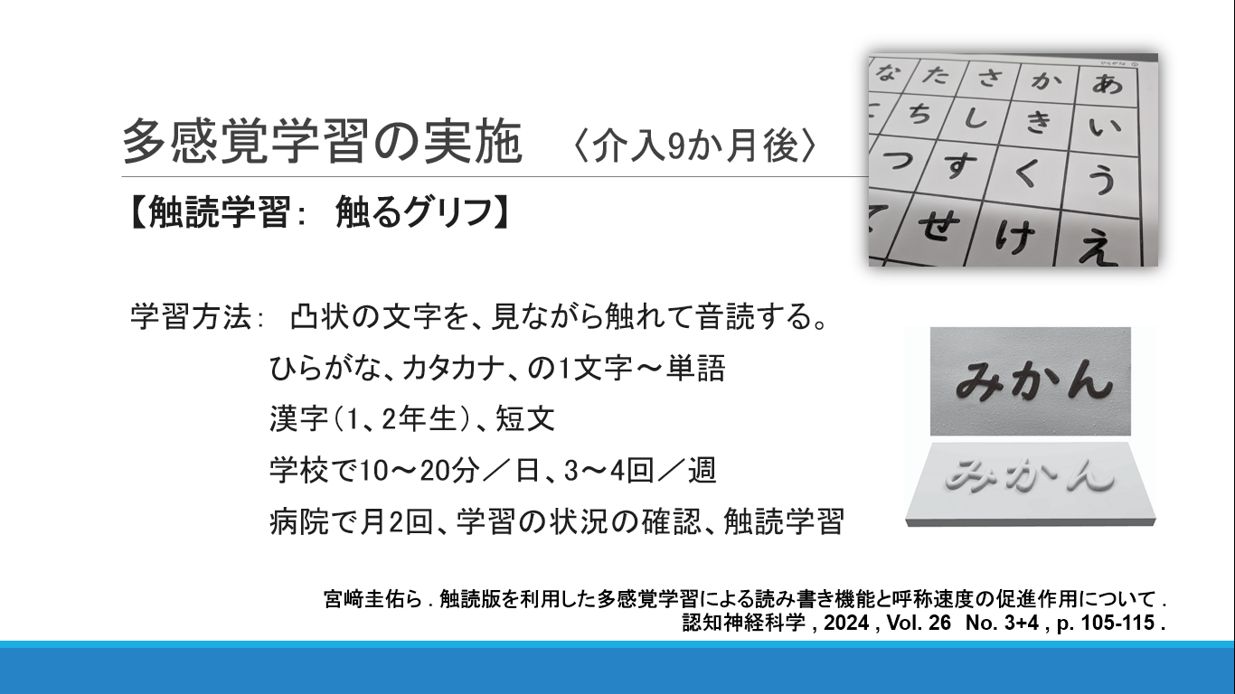 全般知能の遅れと、発達性ディスレクシアの特徴を示す児童に対する触るグリフを用いた8か月間の取り組み事例となります。