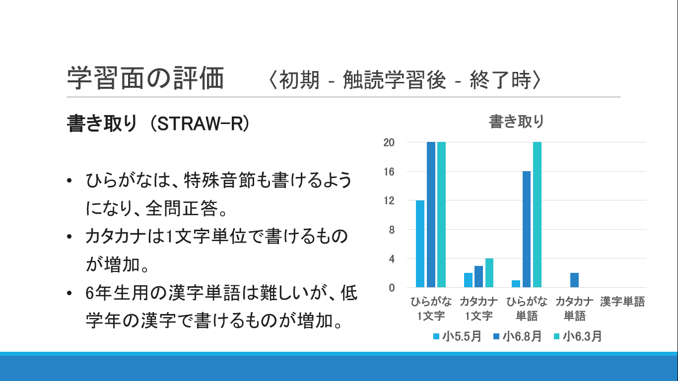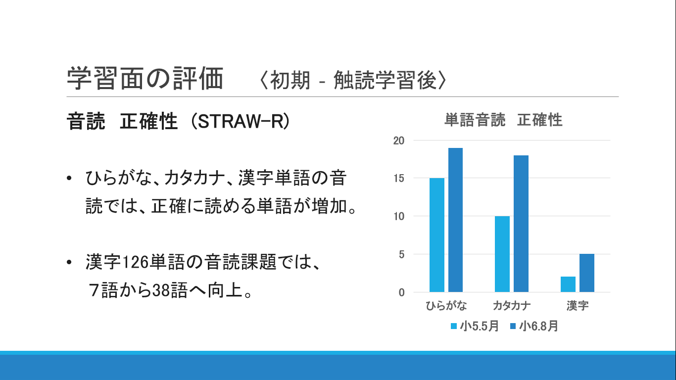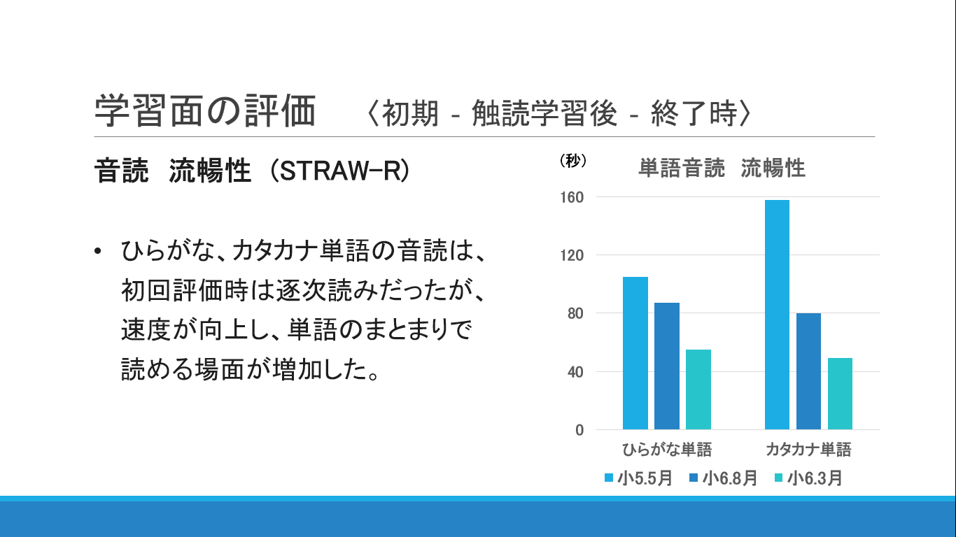 実際のSTRAW-Rの結果です。平仮名、カタカナの音読は、初回評価時は逐次読みでしたが、単語として一纏めに読めるようになり、読み流暢性が改善したとのことです。LD児童の多くが、文字と音の結びつきが弱く、頭の中の言葉と、単語の文字列が結びついていません。つまり単語としての一纏め記憶が未形成なので、単語単位での読みではなく、1文字ずつ確かめる逐次読みになりがちなのです。触るグリフで、仮名1文字、単語、短文と段階的に触読学習を行う事で、文字と音の結びつきの改善に加えて、文字から単語形態単位での記憶形成が促されたと考えます。