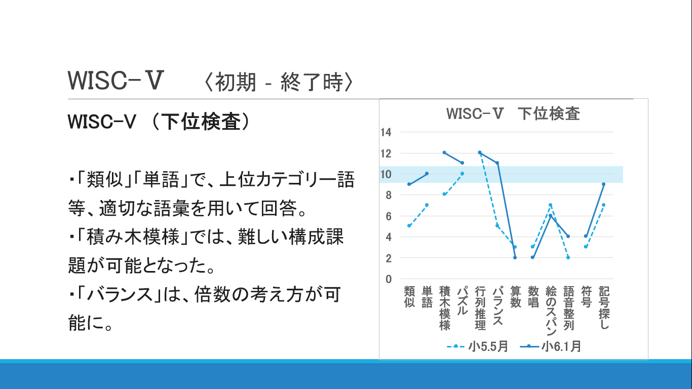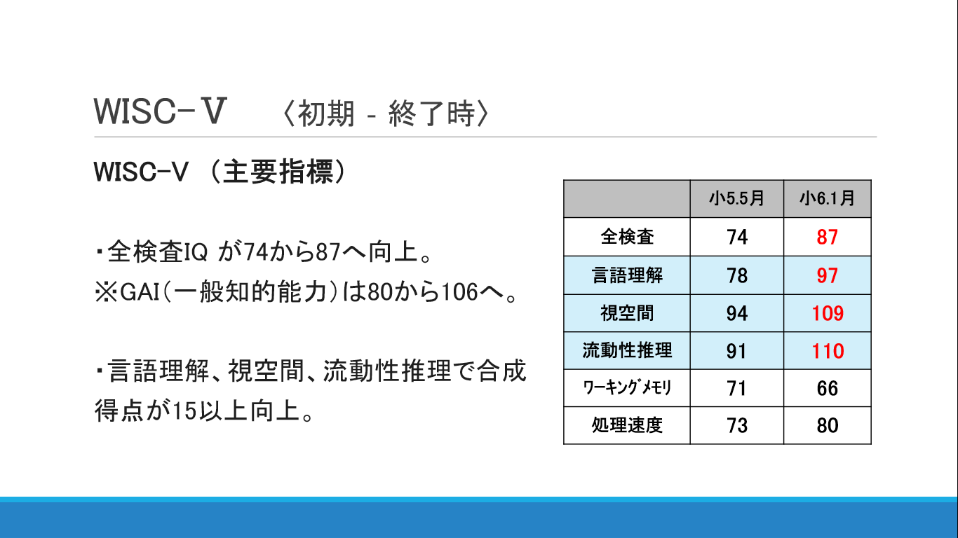 読み流暢性の改善、文字想起の改善、そして、WISKの複数項目の向上がみられました。