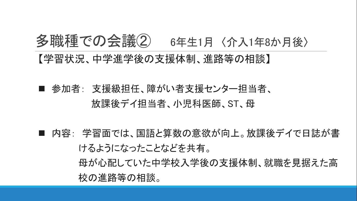 学習全般で底上げ的な変化があったようでした。小学校の支援だけではなく、非木津突き中学入学まで見据えた支援体制、就職を見据えた進路等相談も話し合ったそうです。