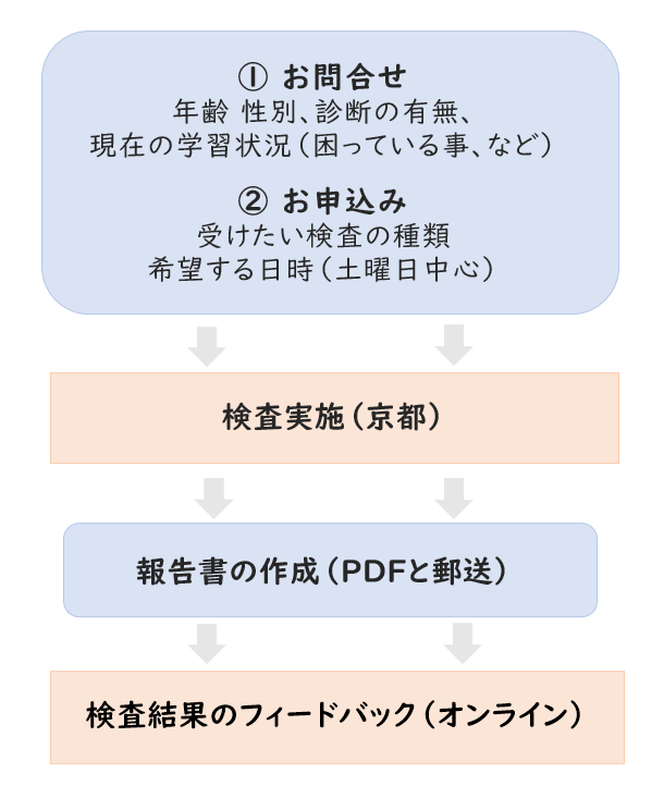 検査を検査を希望される方は、対象者の年齢・性別、現在の読み書き状況、困っている事、発達症の医学的診断の有無などを含めて、お問合せください。予定調整させていただきます。